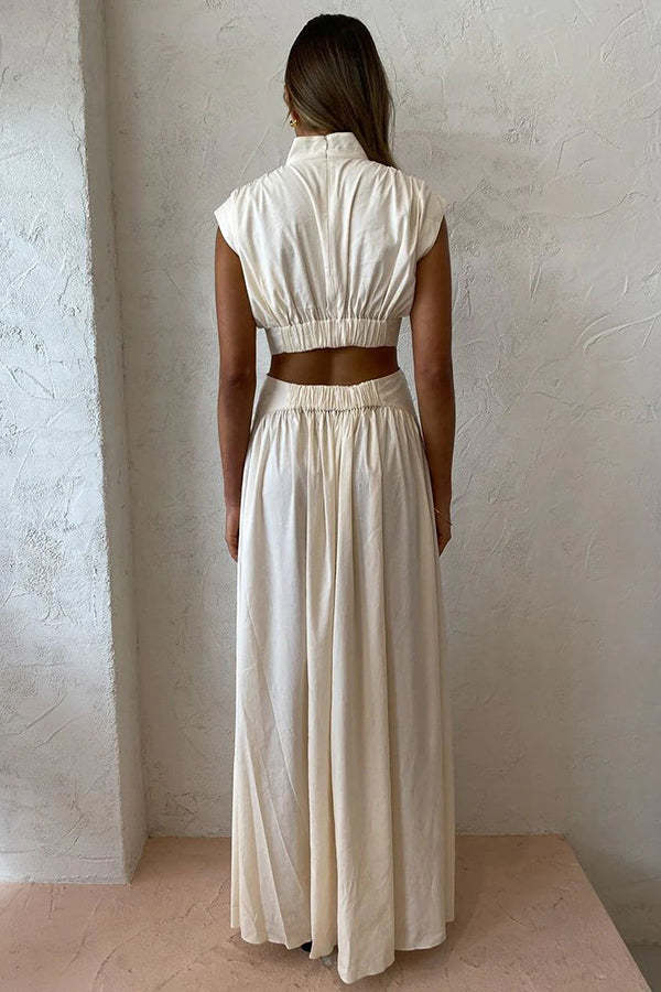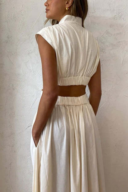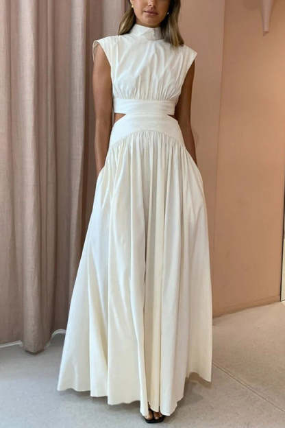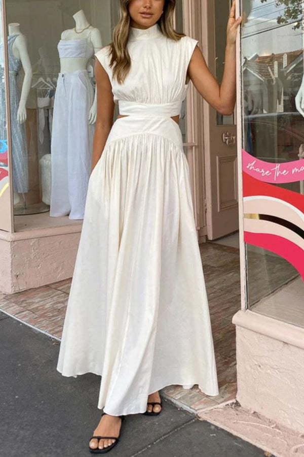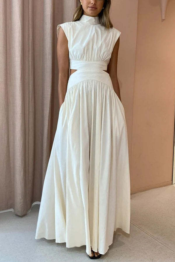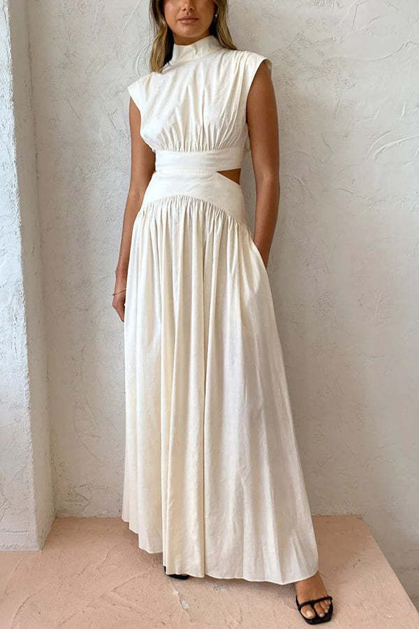 On Vacay Mode Cotton Blend Cutout Elastic Waist Pocketed Maxi Dress